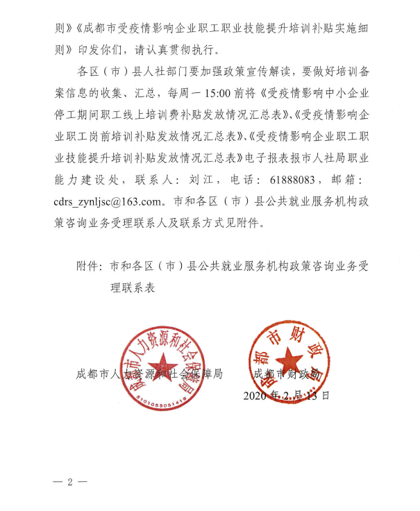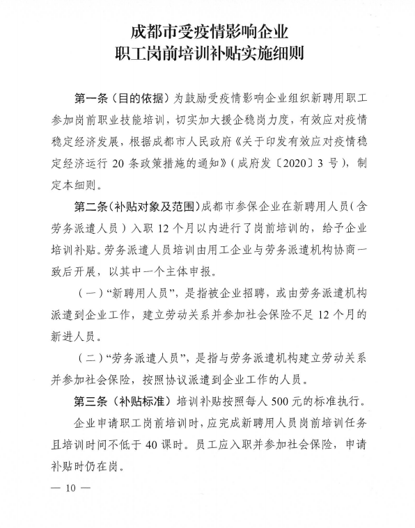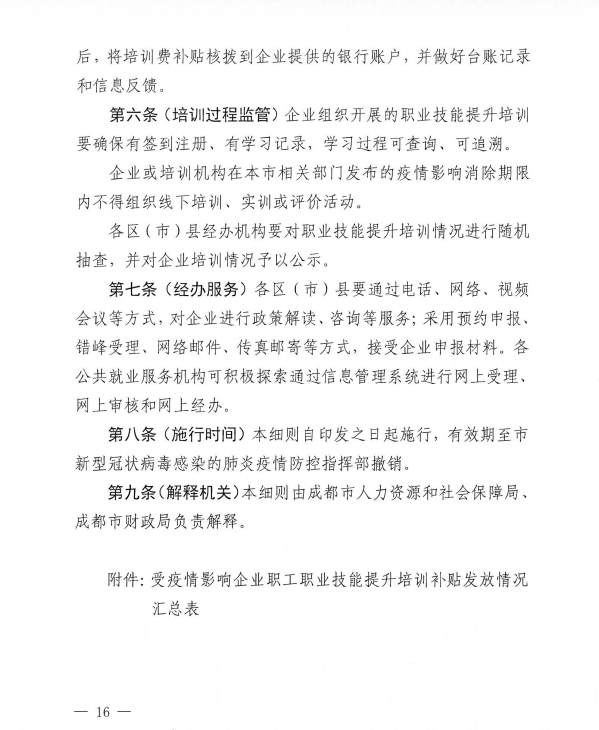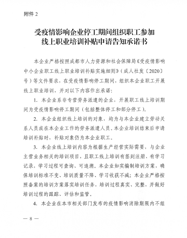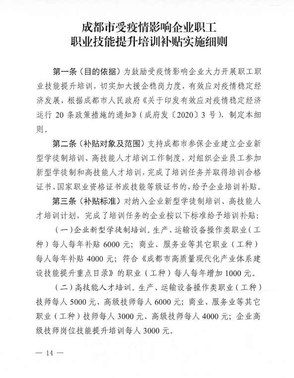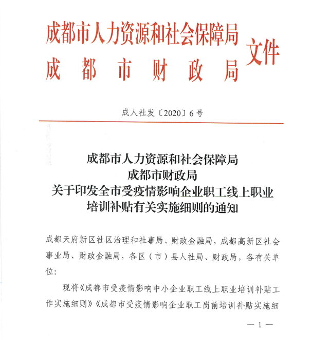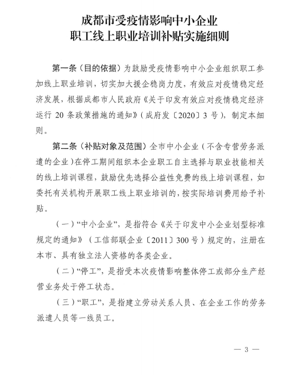 成都(dōu)市(shì)受疫情影(yǐng)響中小(xiǎo )企業(yè)職工(gōng)線上(shàn g)職業(yè)培訓補貼實施細則